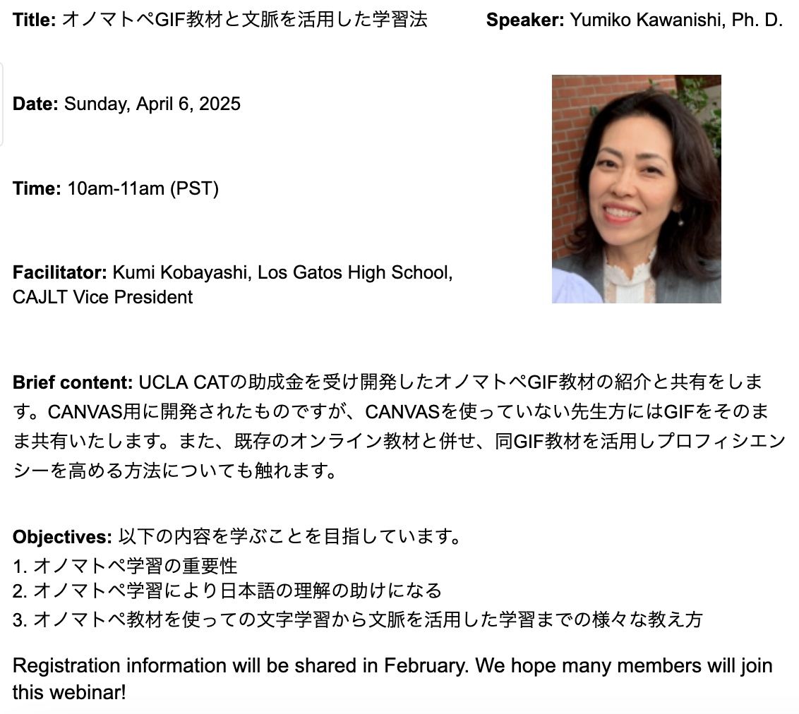 Spring 2025 Workshop Posted on 2025-04-142025-12-14 by cajlt UCLA CATの助成金を受け開発したオノマトペGIF教材の紹介と共有をします。CANVAS用に開発されたものですが、CANVASを使っていない先生方にはGIFをそのまま共有いたします。また、既存のオンライン教材と併せ、同GIF教材を活⽤しプロフィシエンシーを⾼める⽅法についても触れます。 共有: Click to email a link to a friend (Opens in new window) Email Click to share on Facebook (Opens in new window) Facebook Like Loading... Related