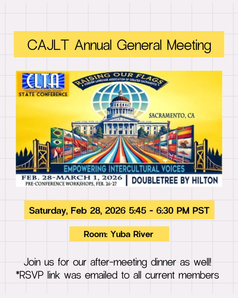 Calling all supporters of Japanese language education! Please stop by to join our CAJLT community to engage in conversations with fellow educators – including sharing brilliant classroom ideas as well as timely concerns for Japanese education. Leave this meeting with a renewed sense of community, take home resources for your teaching, and walk away with a bright smile and a full heart!
