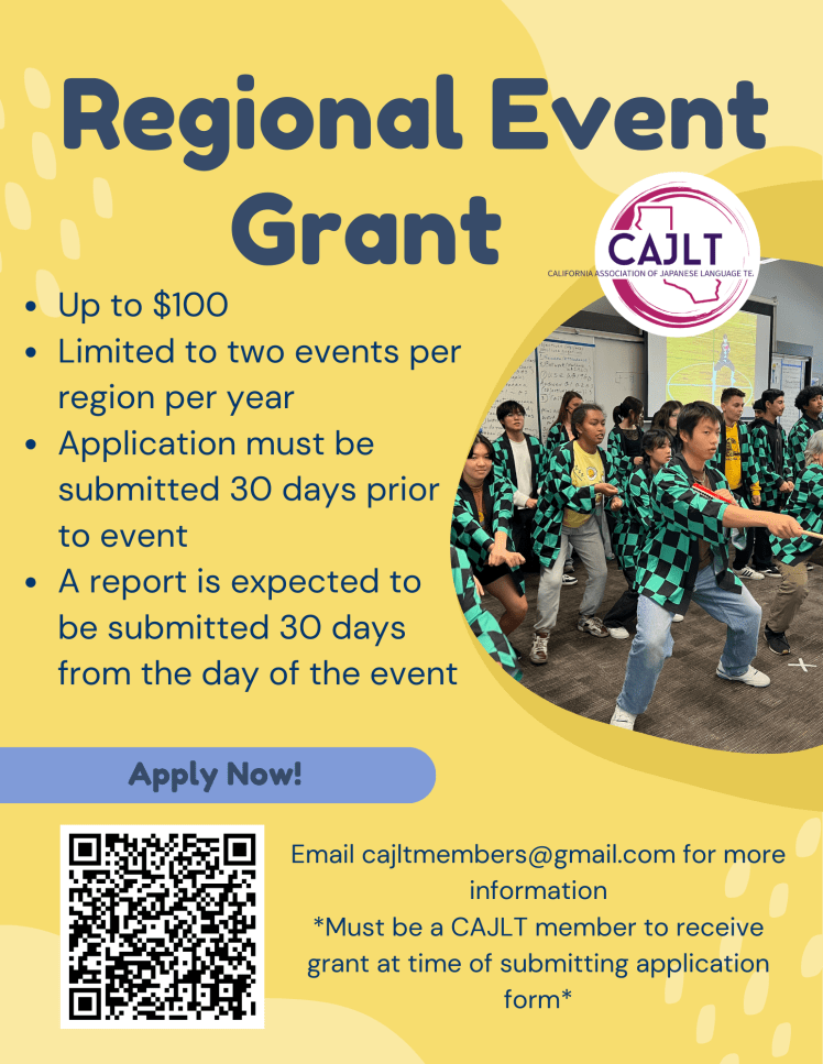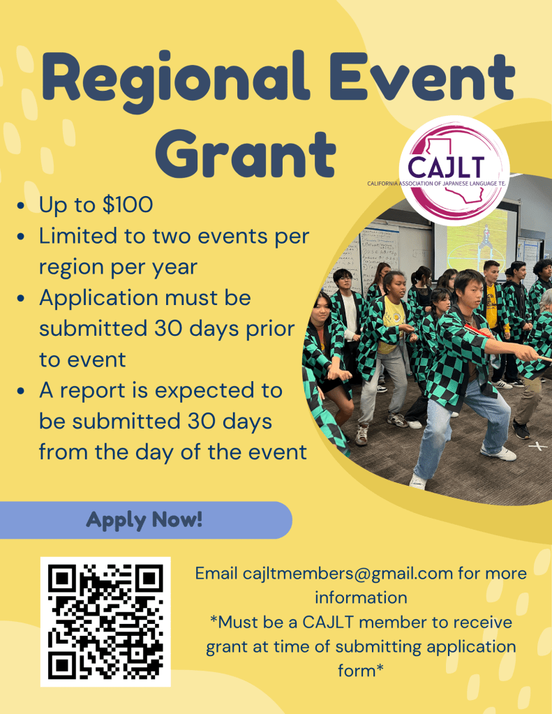 To show our support to advocate for Japanese programs in your region, we are pleased to offer a grant for $100 for your event. This is limited to two events per region per year. Note: Applications must be submitted 30 days prior to the event to be considered for review.