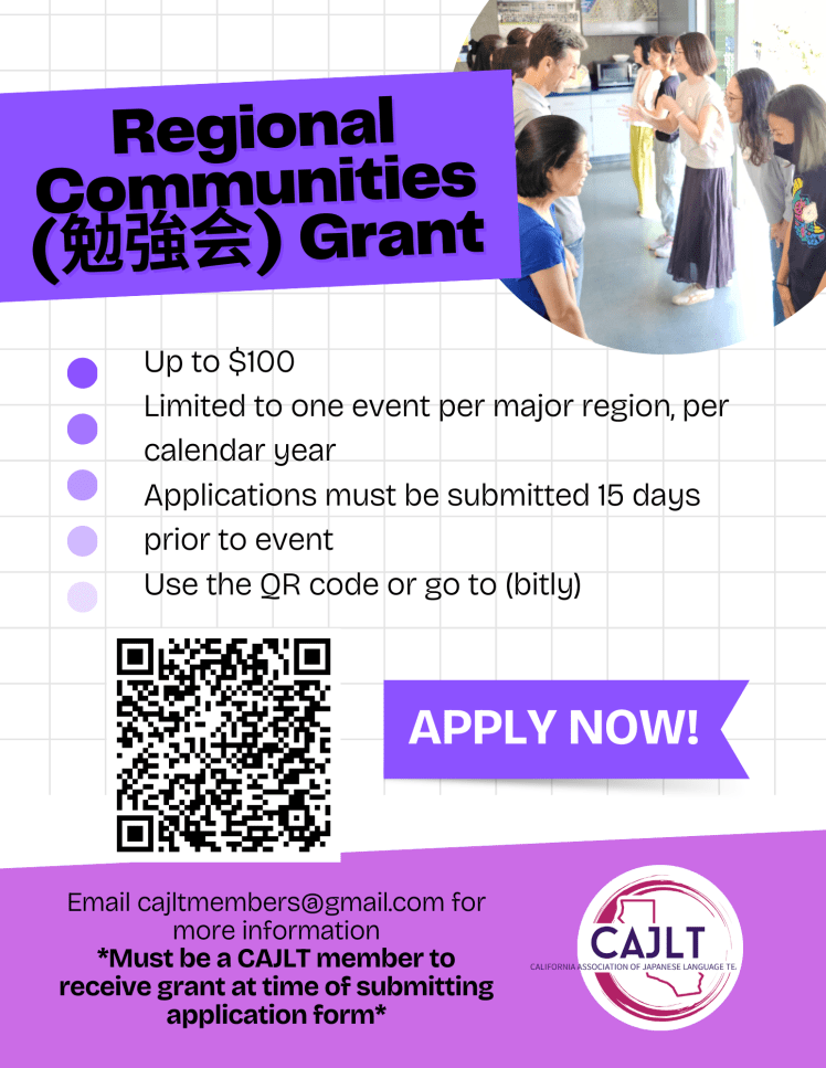 CAJLT values the power of Japanese teachers supporting each other at the grassroots level, in the form of regional benkyokai (勉強会). We are pleased to offer a grant for $100 to support your region’s benkyokai. This grant is limited to one benkyokai , per major region, per calendar year.
